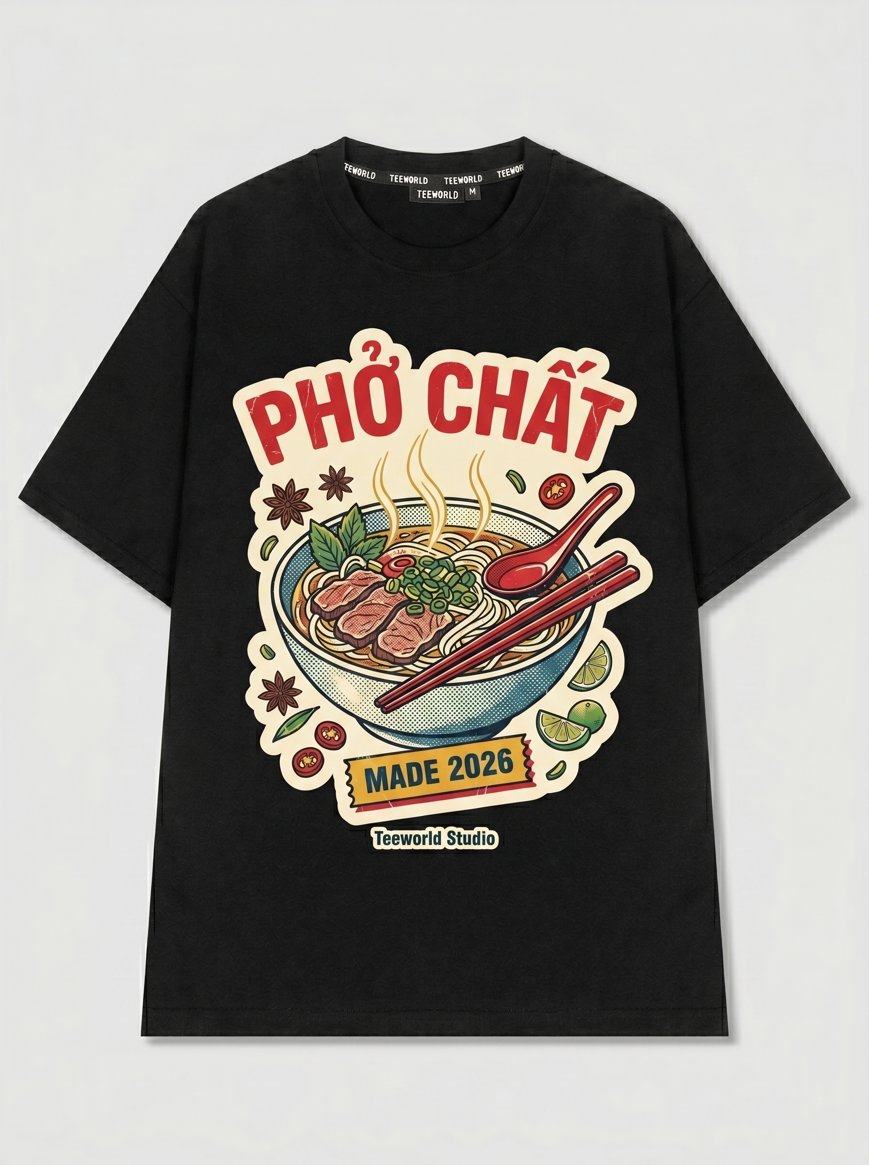 Bát Phở - Thiết kế độc quyền từ Teeworld. Chất liệu: Cotton Premium 250gsm, form oversize thoải mái. In ấn: Công nghệ in sắc nét, bền màu sau nhiều lần giặt. Phong cách: Streetwear hiện đại, dễ phối đồ.