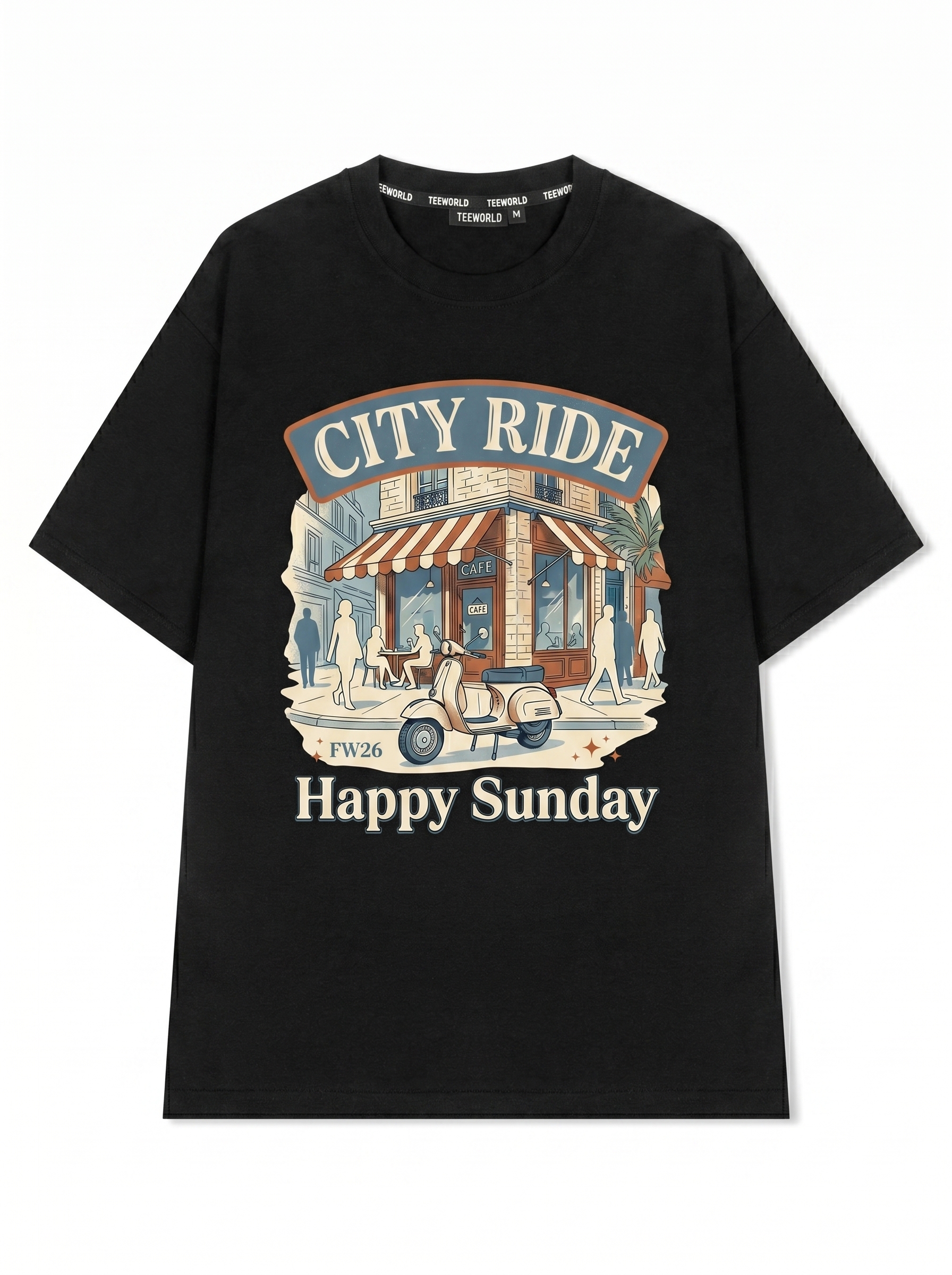 Cafe Streets - Thiết kế độc quyền từ Happy Sunday. Chất liệu: Cotton Premium 250gsm, form oversize thoải mái. In ấn: Công nghệ in sắc nét, bền màu sau nhiều lần giặt. Phong cách: Đồ họa nghệ thuật, nổi bật.