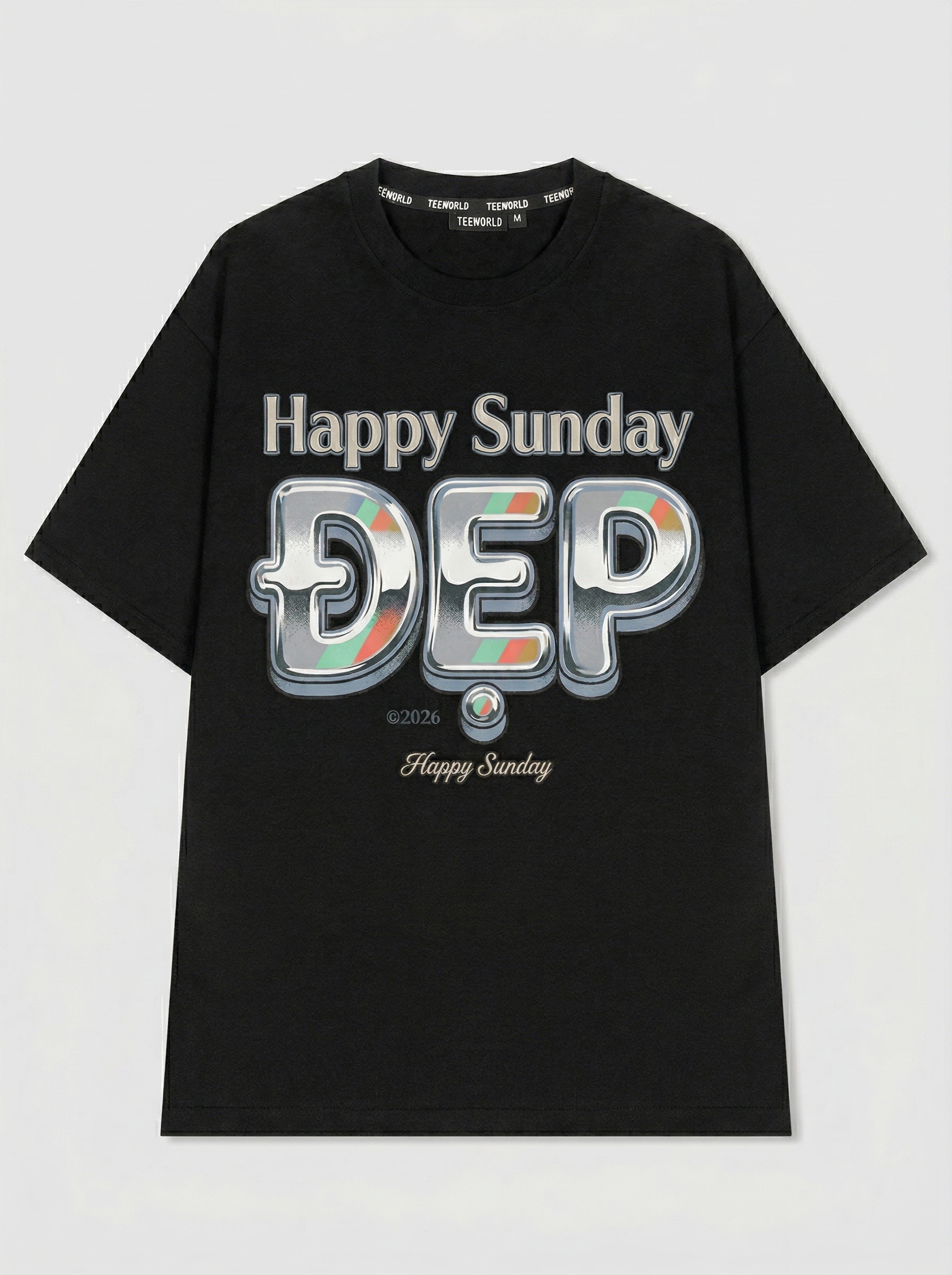 Chrome Bliss - Thiết kế độc quyền từ Happy Sunday. Chất liệu: Cotton Premium 250gsm, form oversize thoải mái. In ấn: Công nghệ in sắc nét, bền màu sau nhiều lần giặt. Phong cách: Đồ họa nghệ thuật, nổi bật.
