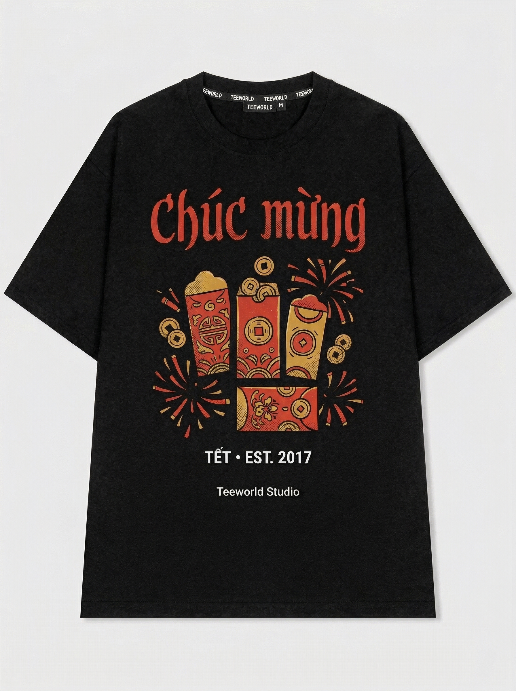 Chúc Mừng Tết - Thiết kế độc quyền từ Teeworld. Chất liệu: Cotton Premium 250gsm, form oversize thoải mái. In ấn: Công nghệ in sắc nét, bền màu sau nhiều lần giặt. Phong cách: Streetwear hiện đại, dễ phối đồ.