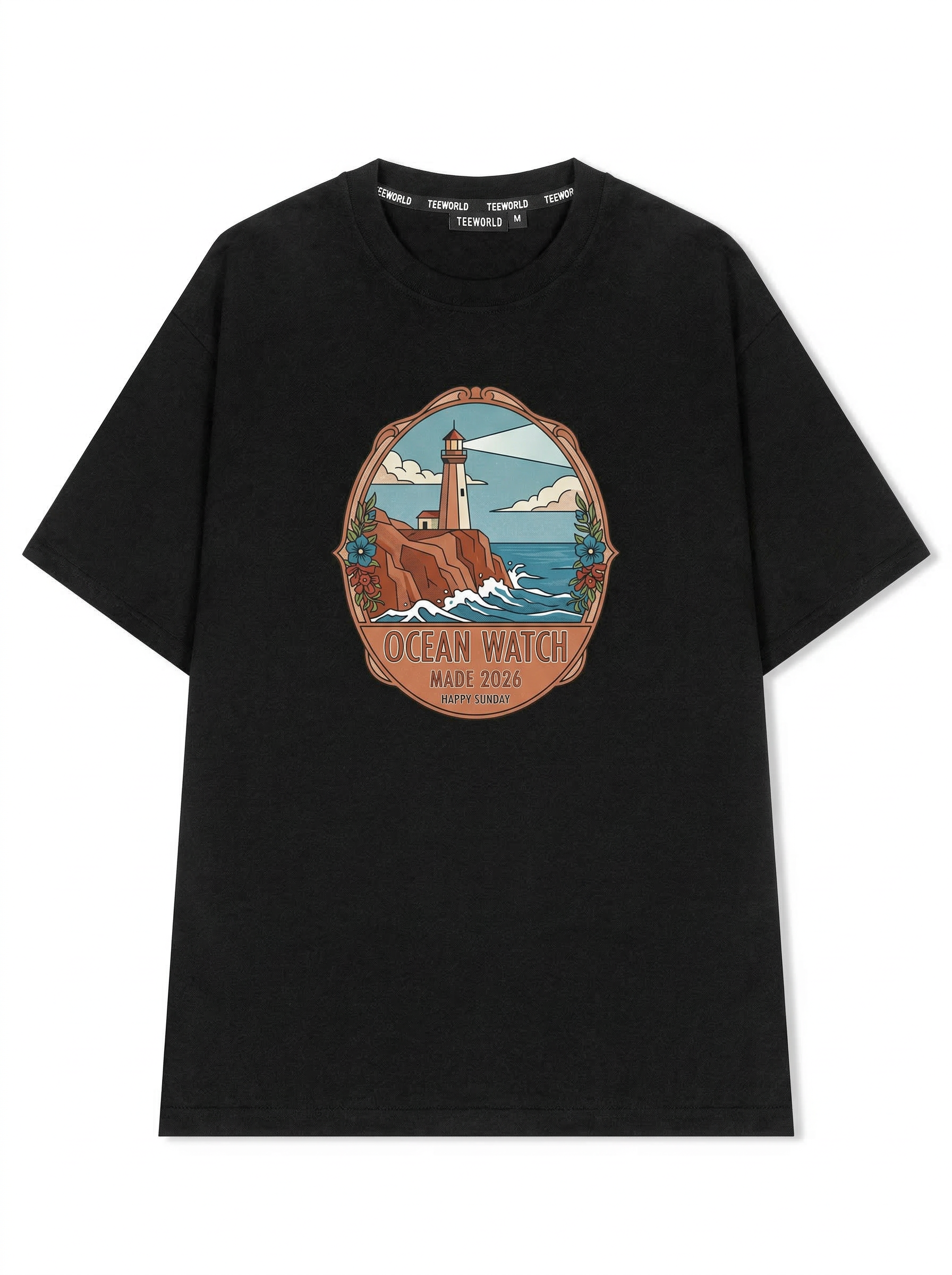 Coastal Beacon - Thiết kế độc quyền từ Happy Sunday. Chất liệu: Cotton Premium 250gsm, form oversize thoải mái. In ấn: Công nghệ in sắc nét, bền màu sau nhiều lần giặt. Phong cách: Đồ họa nghệ thuật, nổi bật.