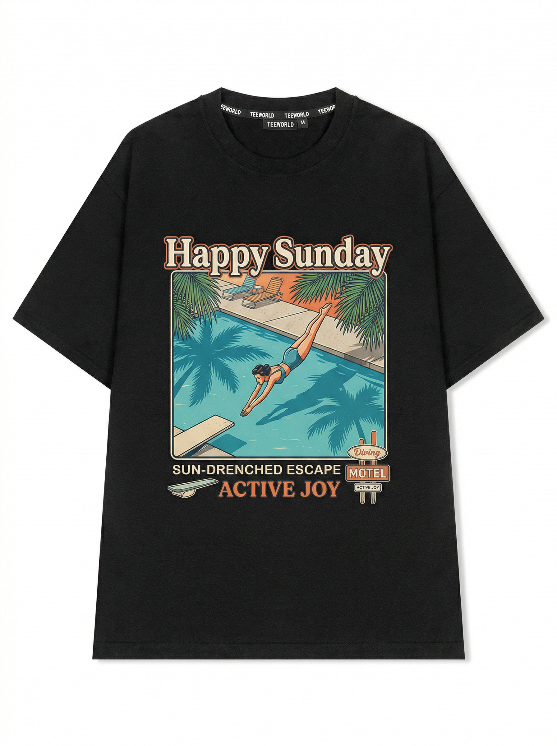 Dive Into Joy - Thiết kế độc quyền từ Happy Sunday. Chất liệu: Cotton Premium 250gsm, form oversize thoải mái. In ấn: Công nghệ in sắc nét, bền màu sau nhiều lần giặt. Phong cách: Đồ họa nghệ thuật, nổi bật.