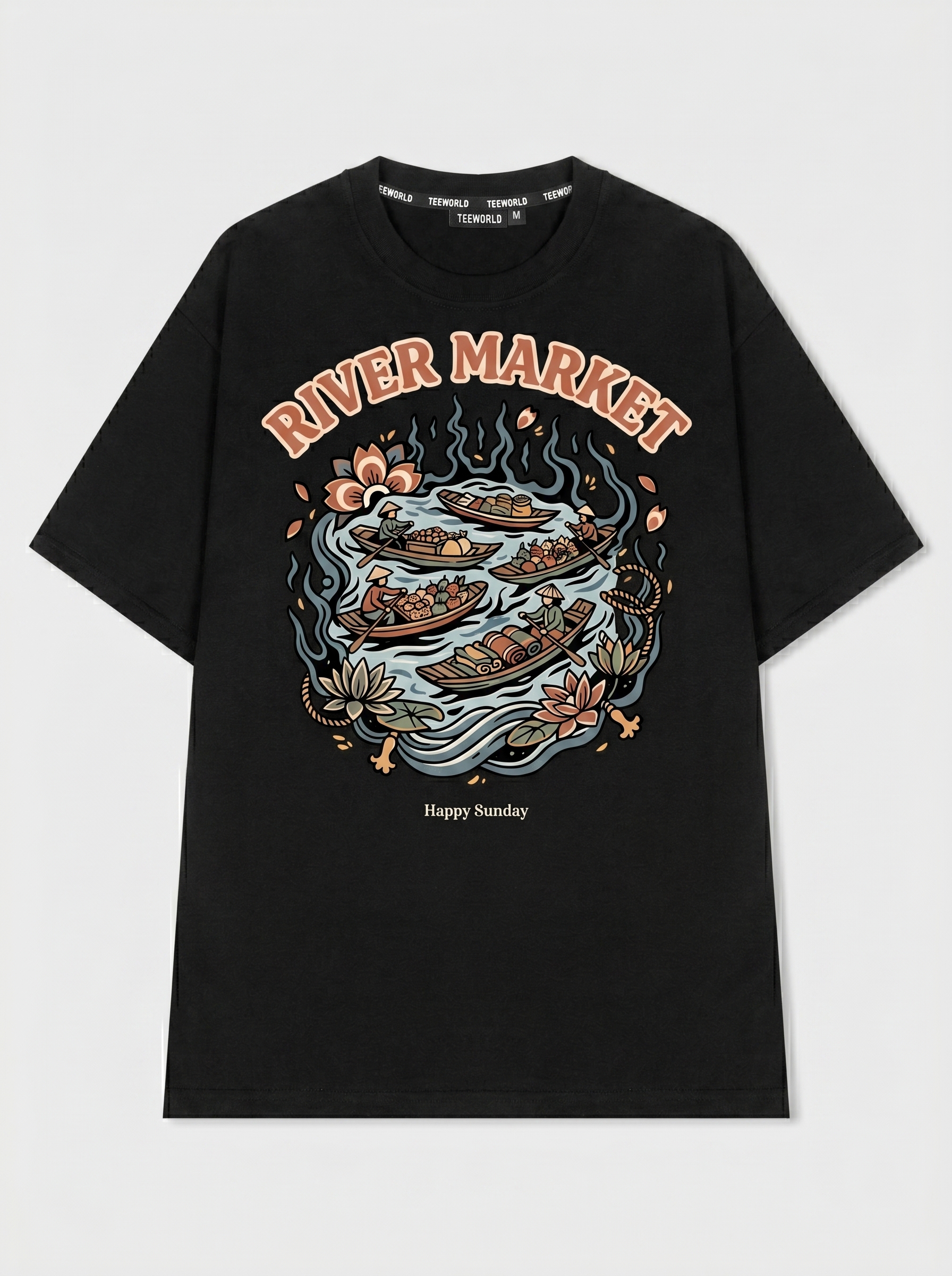 Floating Market - Thiết kế độc quyền từ Happy Sunday. Chất liệu: Cotton Premium 250gsm, form oversize thoải mái. In ấn: Công nghệ in sắc nét, bền màu sau nhiều lần giặt. Phong cách: Đồ họa nghệ thuật, nổi bật.