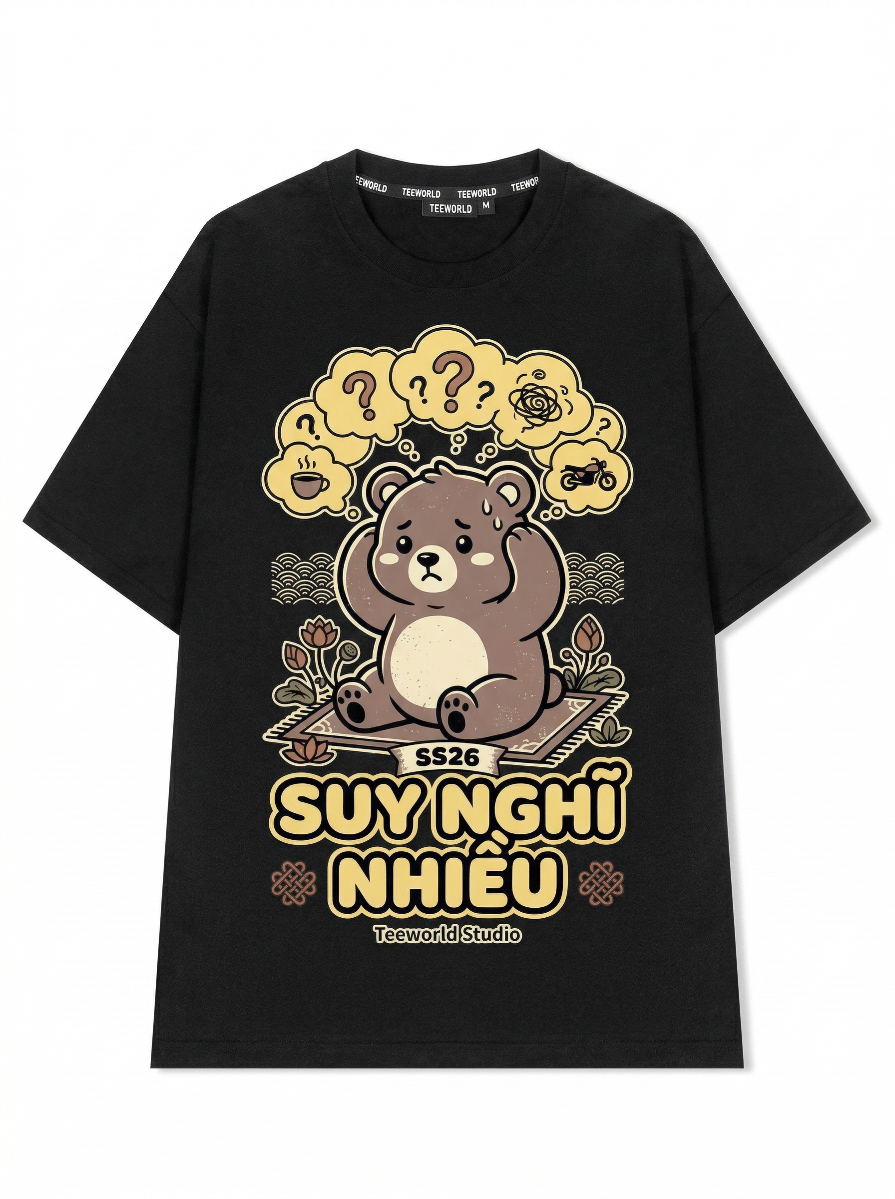 Gấu Trầm Tư - Thiết kế độc quyền từ Teeworld. Chất liệu: Cotton Premium 250gsm, form oversize thoải mái. In ấn: Công nghệ in sắc nét, bền màu sau nhiều lần giặt. Phong cách: Streetwear hiện đại, dễ phối đồ.