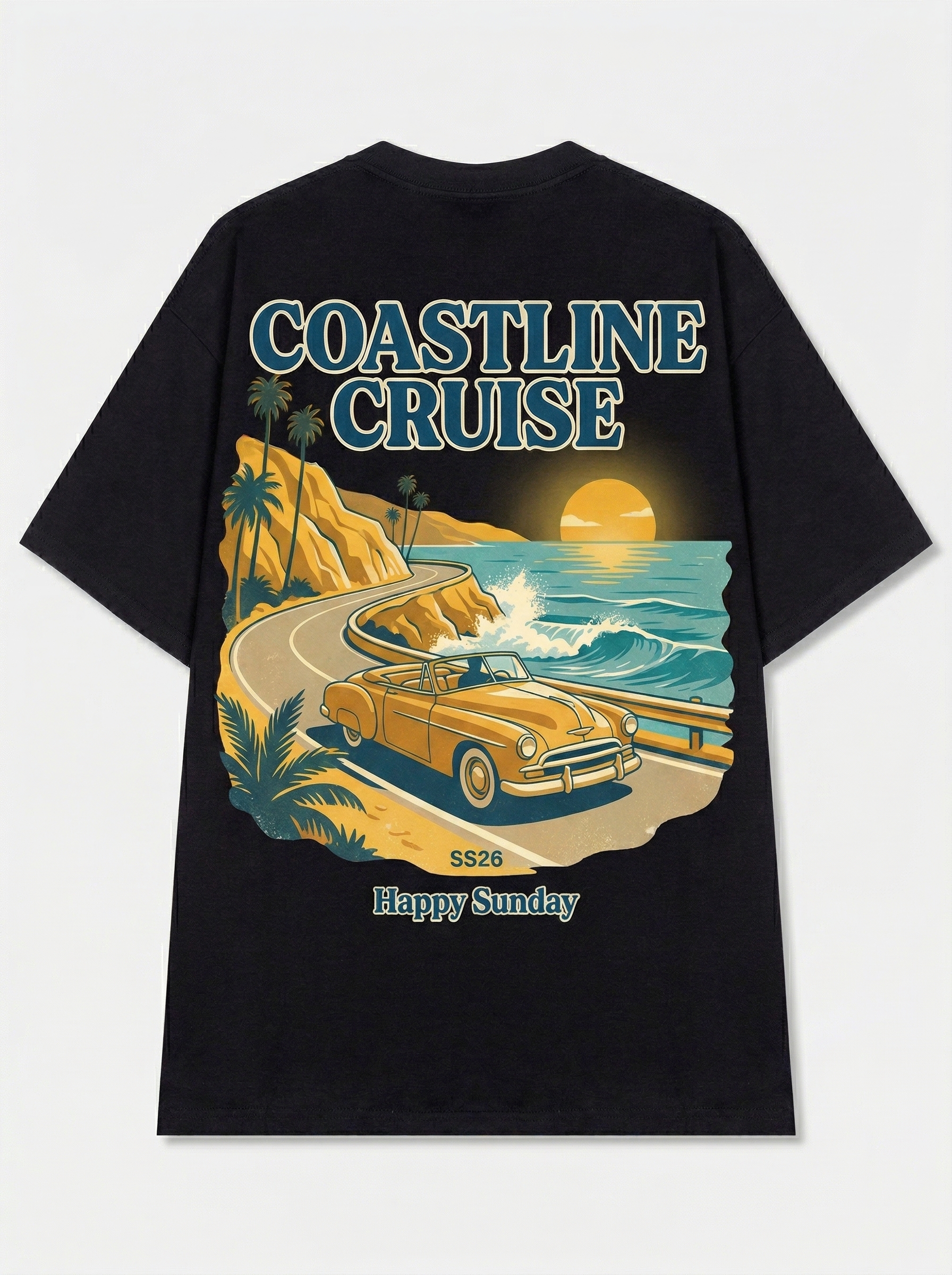 Golden Drive - Thiết kế độc quyền từ Happy Sunday. Chất liệu: Cotton Premium 250gsm, form oversize thoải mái. In ấn: Công nghệ in sắc nét, bền màu sau nhiều lần giặt. Phong cách: Đồ họa nghệ thuật, nổi bật.