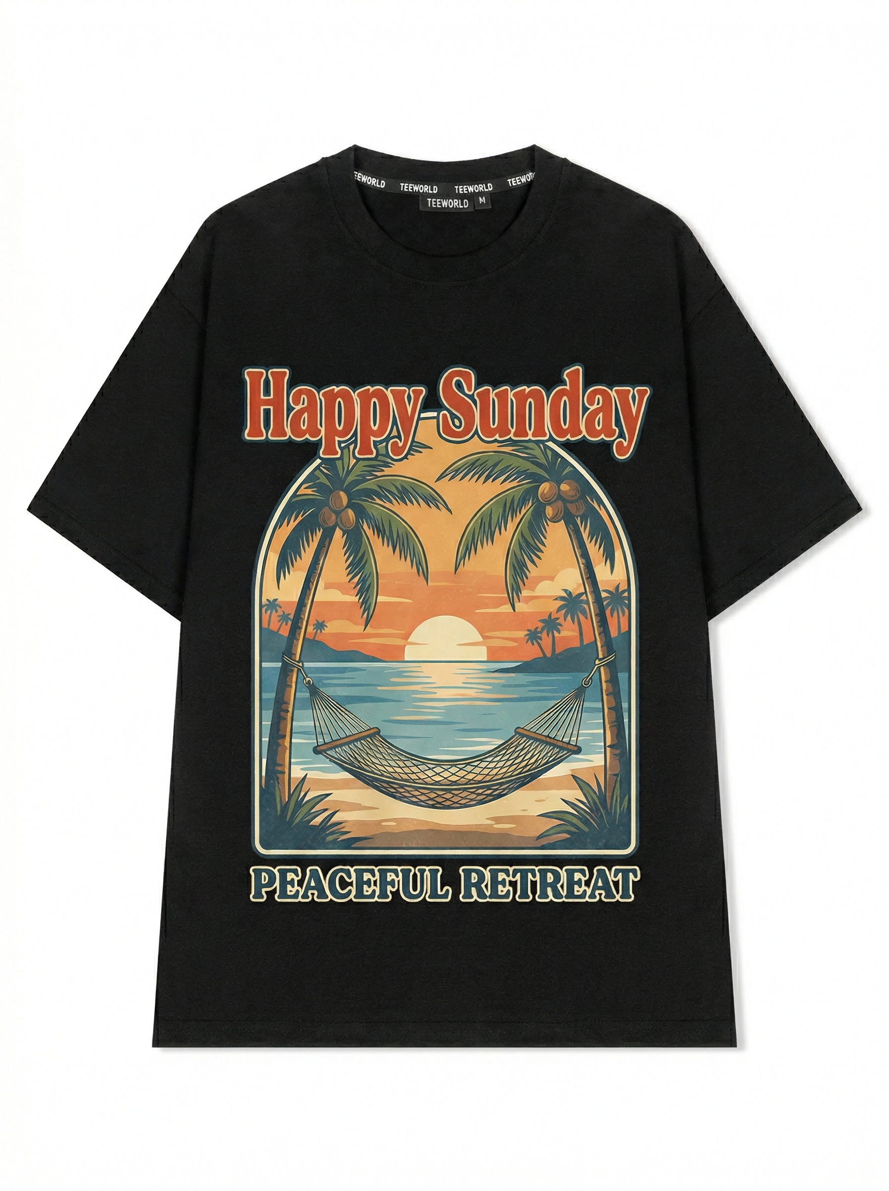 Golden Retreat - Thiết kế độc quyền từ Happy Sunday. Chất liệu: Cotton Premium 250gsm, form oversize thoải mái. In ấn: Công nghệ in sắc nét, bền màu sau nhiều lần giặt. Phong cách: Đồ họa nghệ thuật, nổi bật.