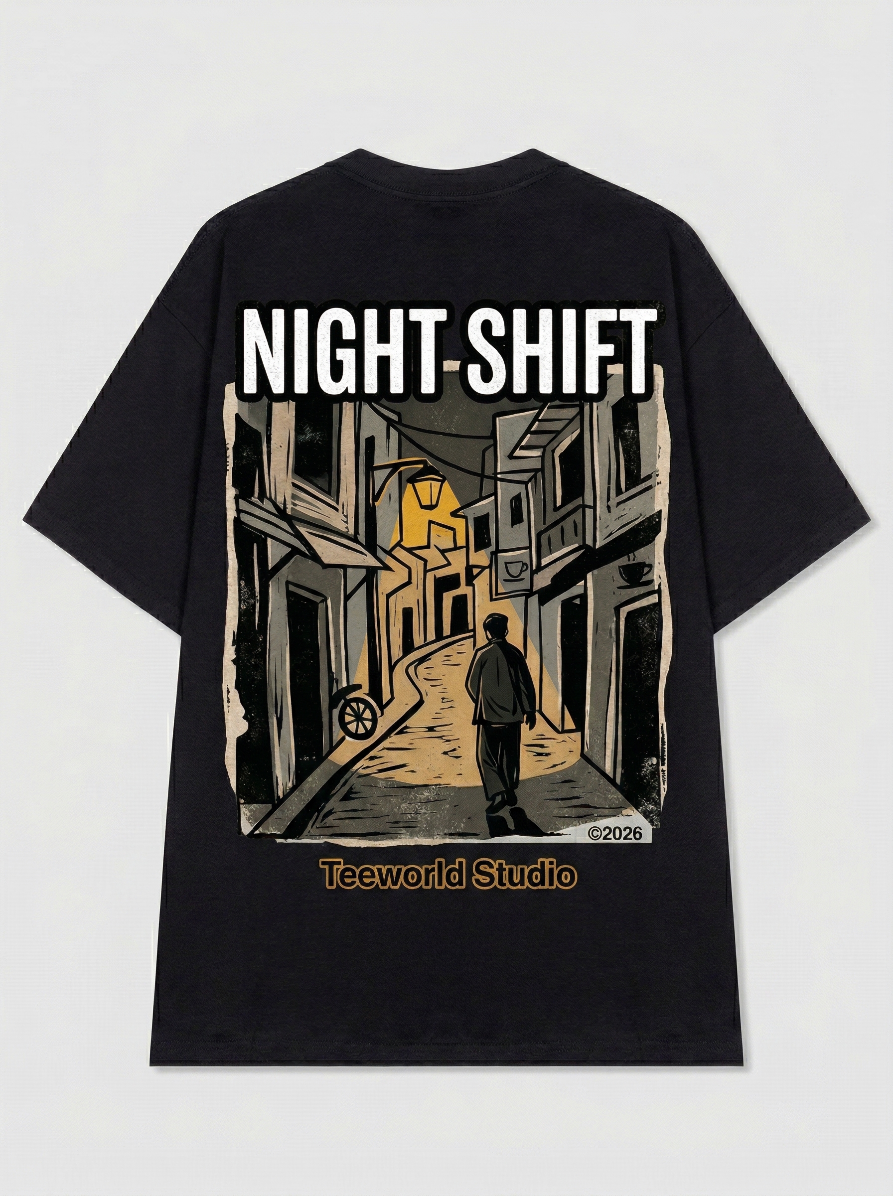 Hẻm Đêm - Thiết kế độc quyền từ Teeworld. Chất liệu: Cotton Premium 250gsm, form oversize thoải mái. In ấn: Công nghệ in sắc nét, bền màu sau nhiều lần giặt. Phong cách: Streetwear hiện đại, dễ phối đồ.