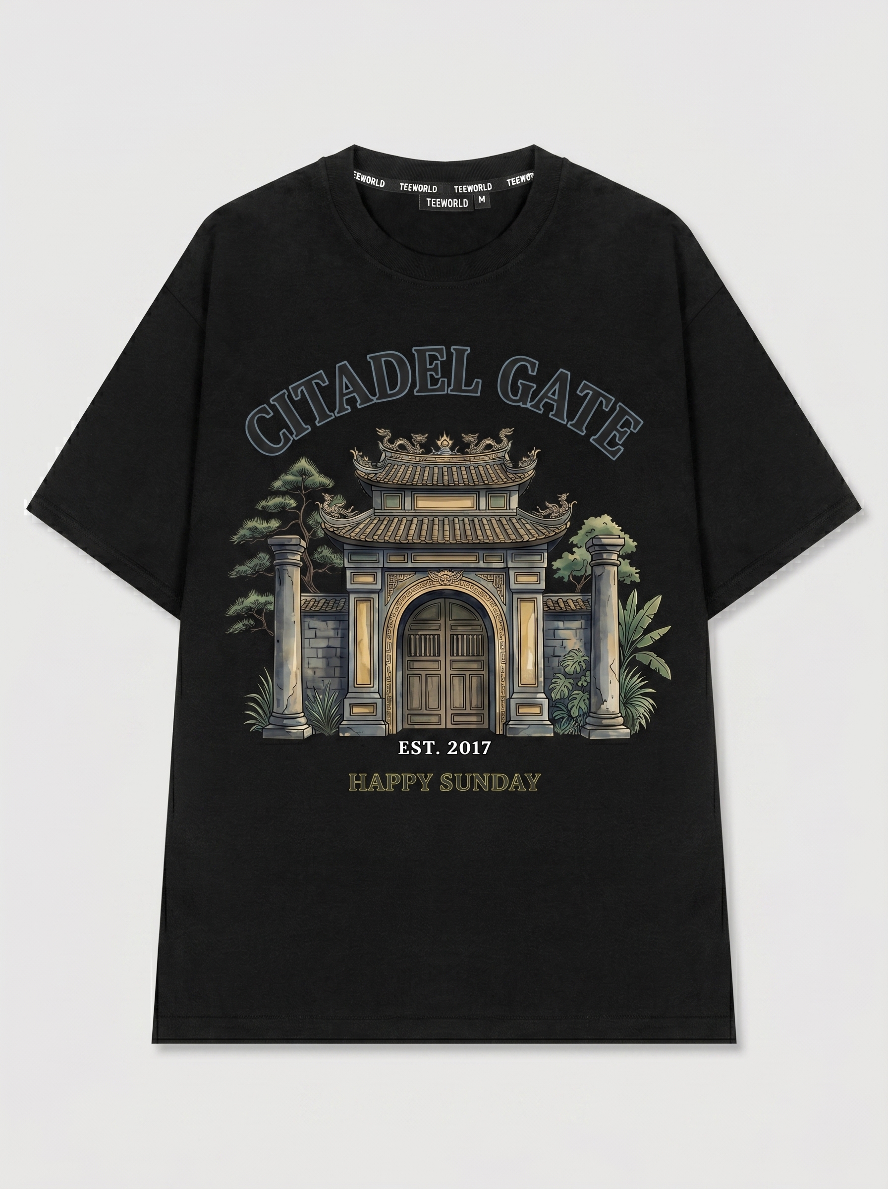 Imperial Arch - Thiết kế độc quyền từ Happy Sunday. Chất liệu: Cotton Premium 250gsm, form oversize thoải mái. In ấn: Công nghệ in sắc nét, bền màu sau nhiều lần giặt. Phong cách: Đồ họa nghệ thuật, nổi bật.
