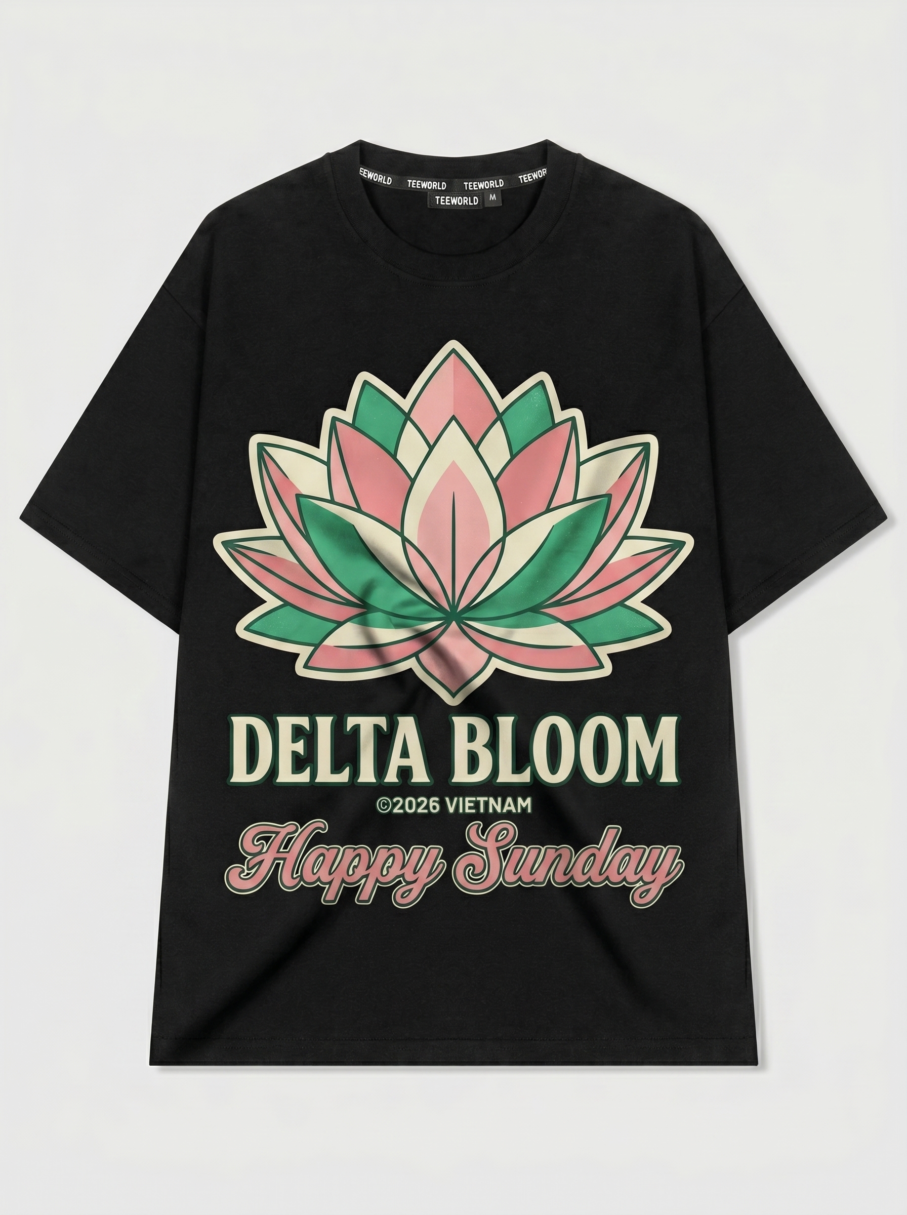 Lotus Petals - Thiết kế độc quyền từ Happy Sunday. Chất liệu: Cotton Premium 250gsm, form oversize thoải mái. In ấn: Công nghệ in sắc nét, bền màu sau nhiều lần giặt. Phong cách: Đồ họa nghệ thuật, nổi bật.