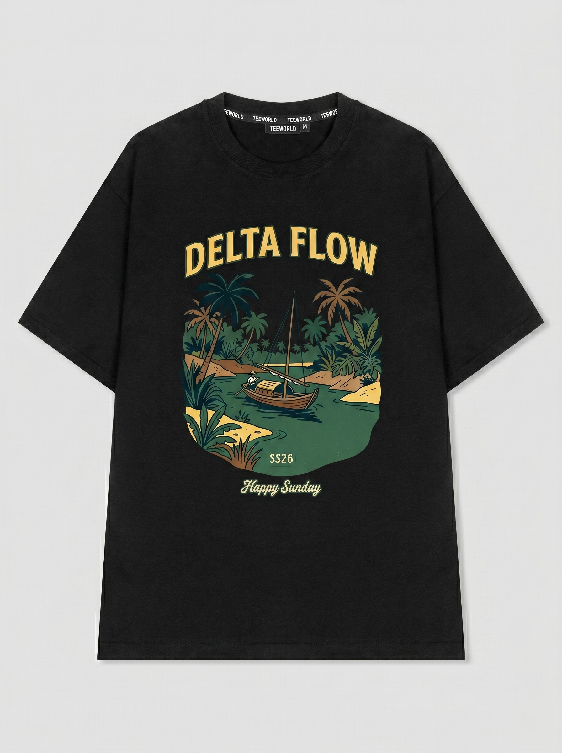 Mekong Drift - Thiết kế độc quyền từ Happy Sunday. Chất liệu: Cotton Premium 250gsm, form oversize thoải mái. In ấn: Công nghệ in sắc nét, bền màu sau nhiều lần giặt. Phong cách: Đồ họa nghệ thuật, nổi bật.