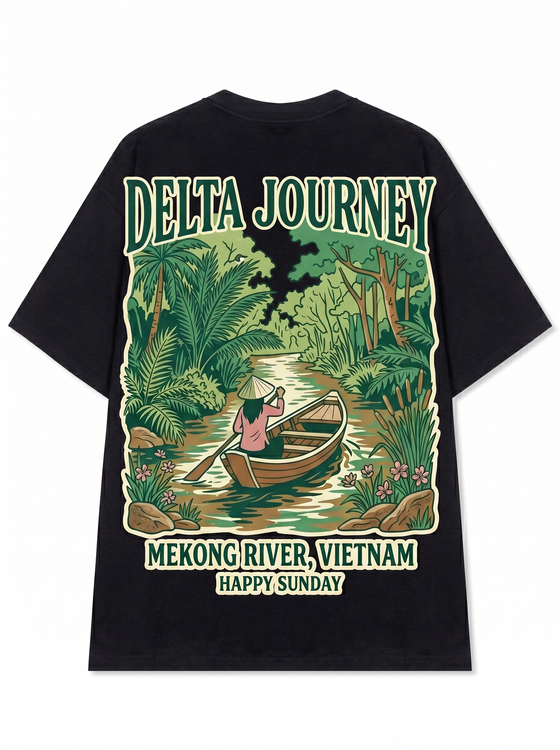 Mekong Flow - Thiết kế độc quyền từ Happy Sunday. Chất liệu: Cotton Premium 250gsm, form oversize thoải mái. In ấn: Công nghệ in sắc nét, bền màu sau nhiều lần giặt. Phong cách: Đồ họa nghệ thuật, nổi bật.