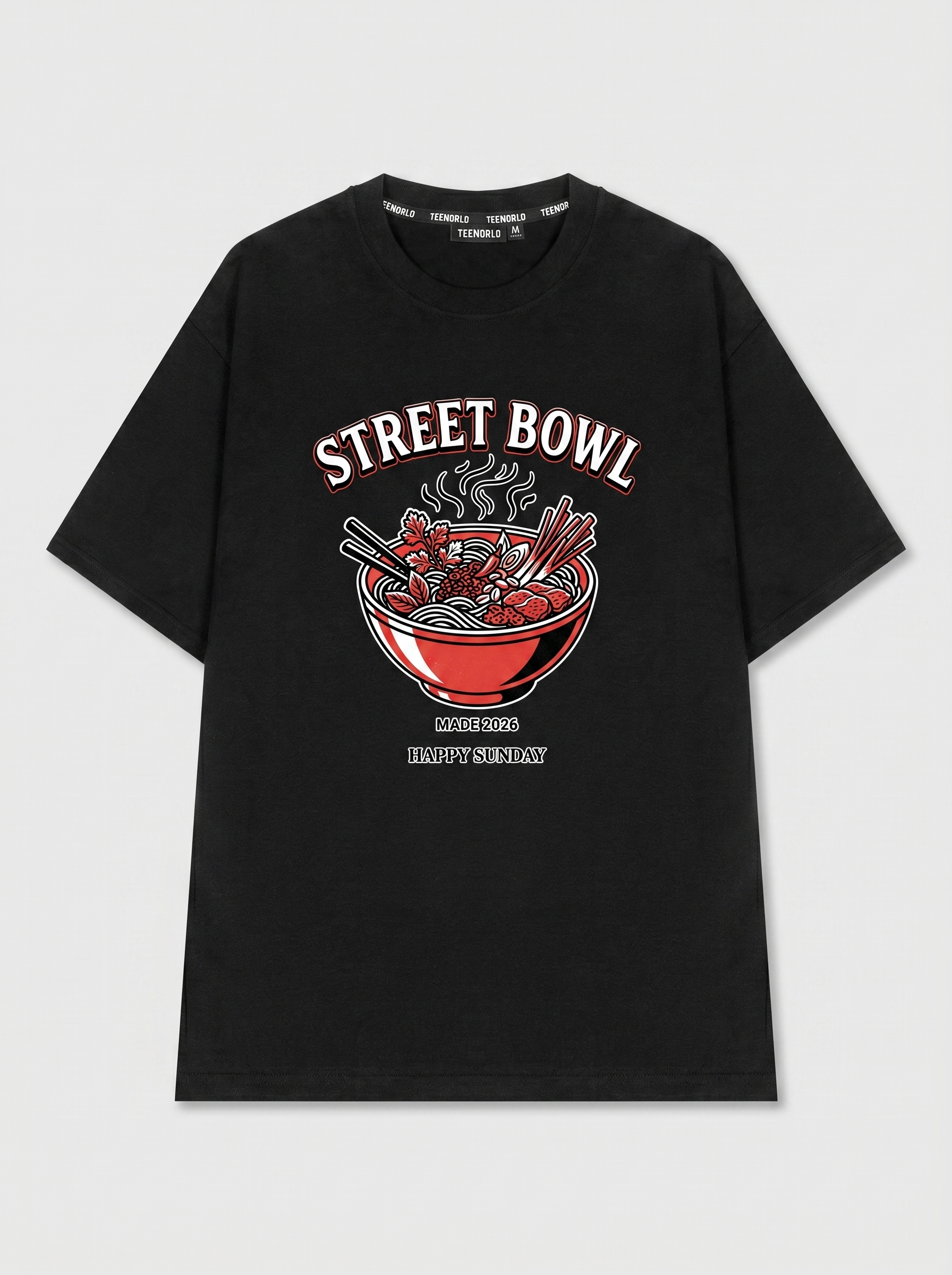 Noodle Delight - Thiết kế độc quyền từ Happy Sunday. Chất liệu: Cotton Premium 250gsm, form oversize thoải mái. In ấn: Công nghệ in sắc nét, bền màu sau nhiều lần giặt. Phong cách: Đồ họa nghệ thuật, nổi bật.