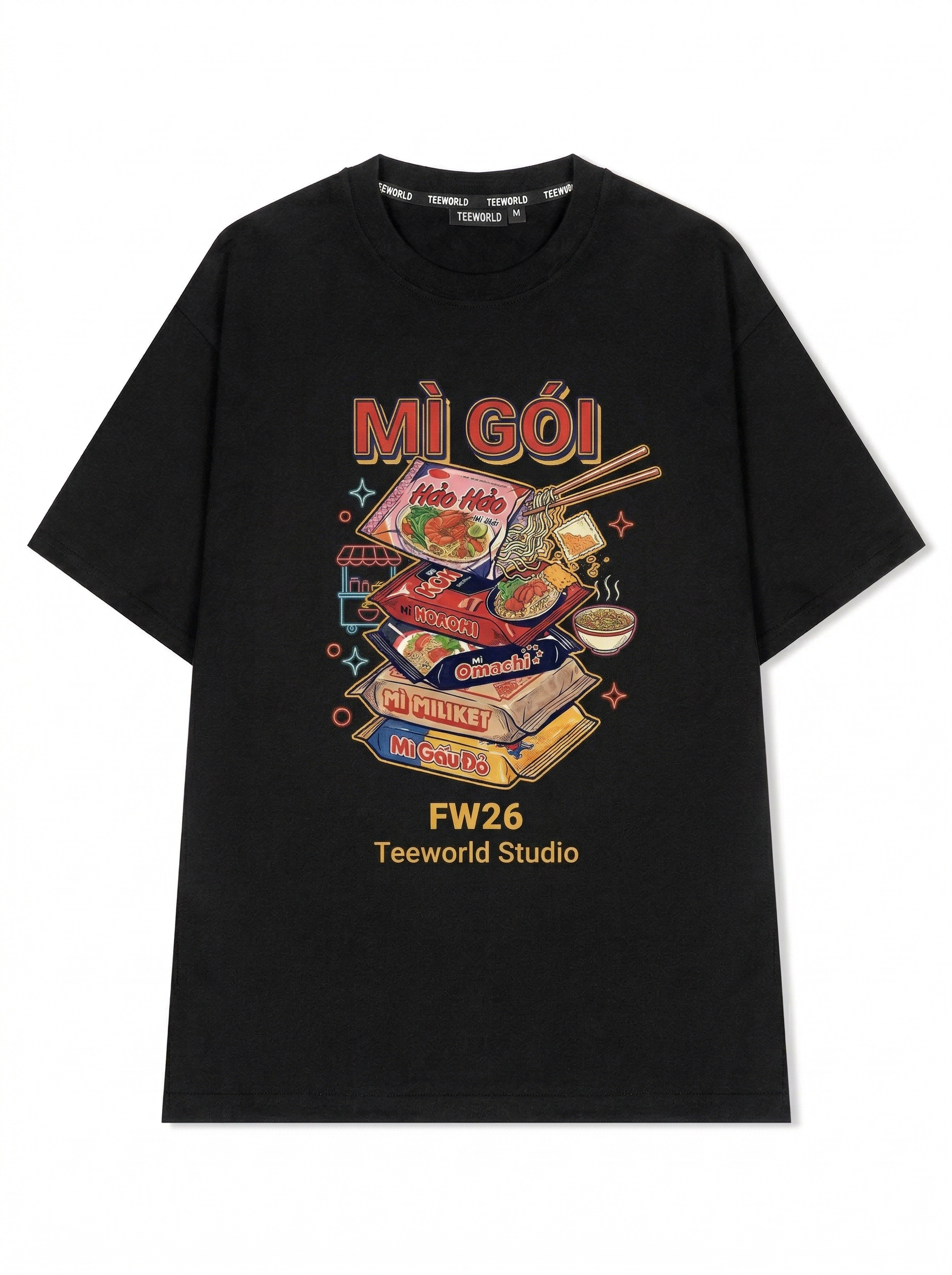 Noodle Stack - Thiết kế độc quyền từ Teeworld. Chất liệu: Cotton Premium 250gsm, form oversize thoải mái. In ấn: Công nghệ in sắc nét, bền màu sau nhiều lần giặt. Phong cách: Streetwear hiện đại, dễ phối đồ.