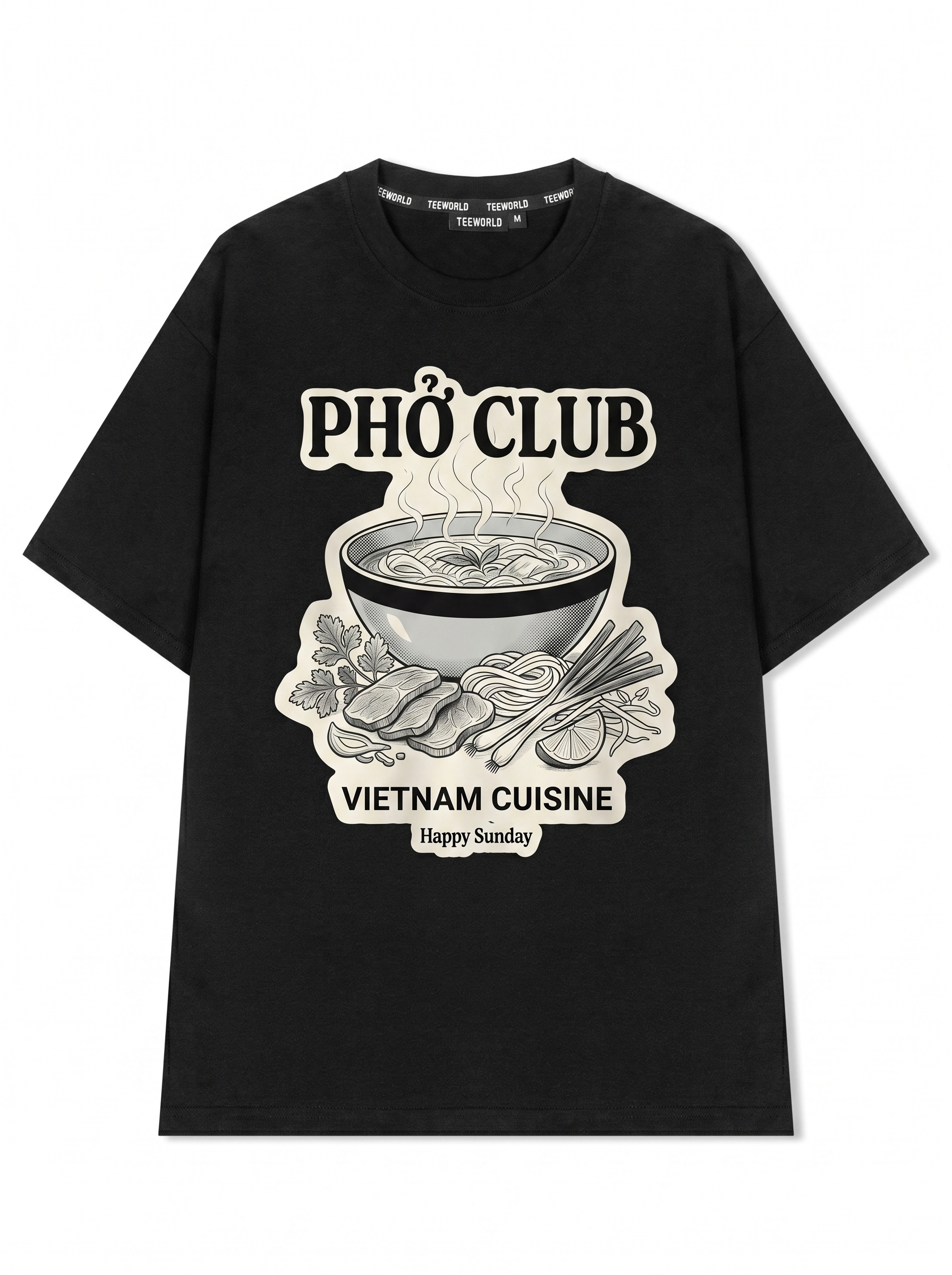Phở House - Thiết kế độc quyền từ Happy Sunday. Chất liệu: Cotton Premium 250gsm, form oversize thoải mái. In ấn: Công nghệ in sắc nét, bền màu sau nhiều lần giặt. Phong cách: Đồ họa nghệ thuật, nổi bật.