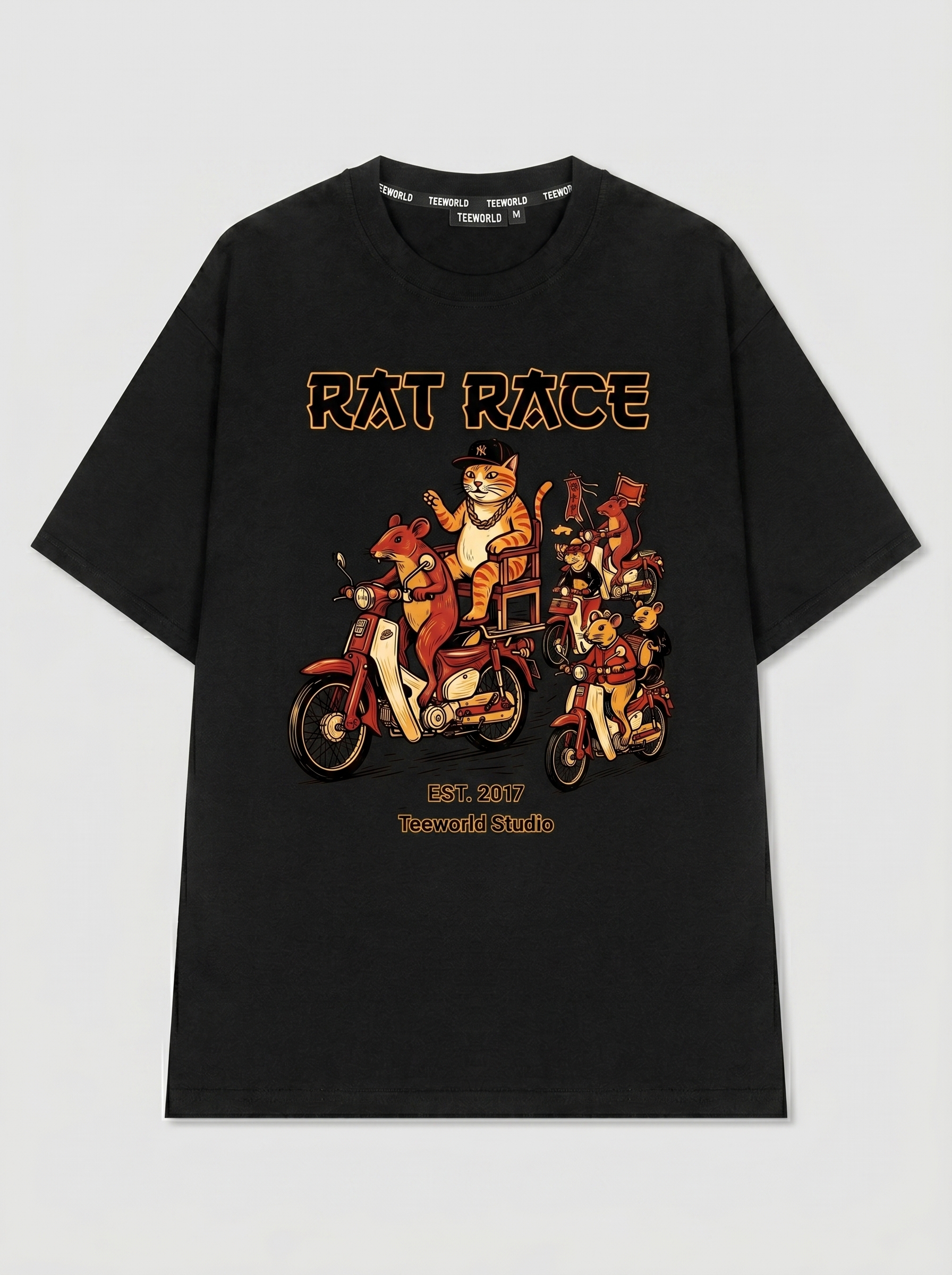 Rats on Bikes - Thiết kế độc quyền từ Teeworld. Chất liệu: Cotton Premium 250gsm, form oversize thoải mái. In ấn: Công nghệ in sắc nét, bền màu sau nhiều lần giặt. Phong cách: Streetwear hiện đại, dễ phối đồ.