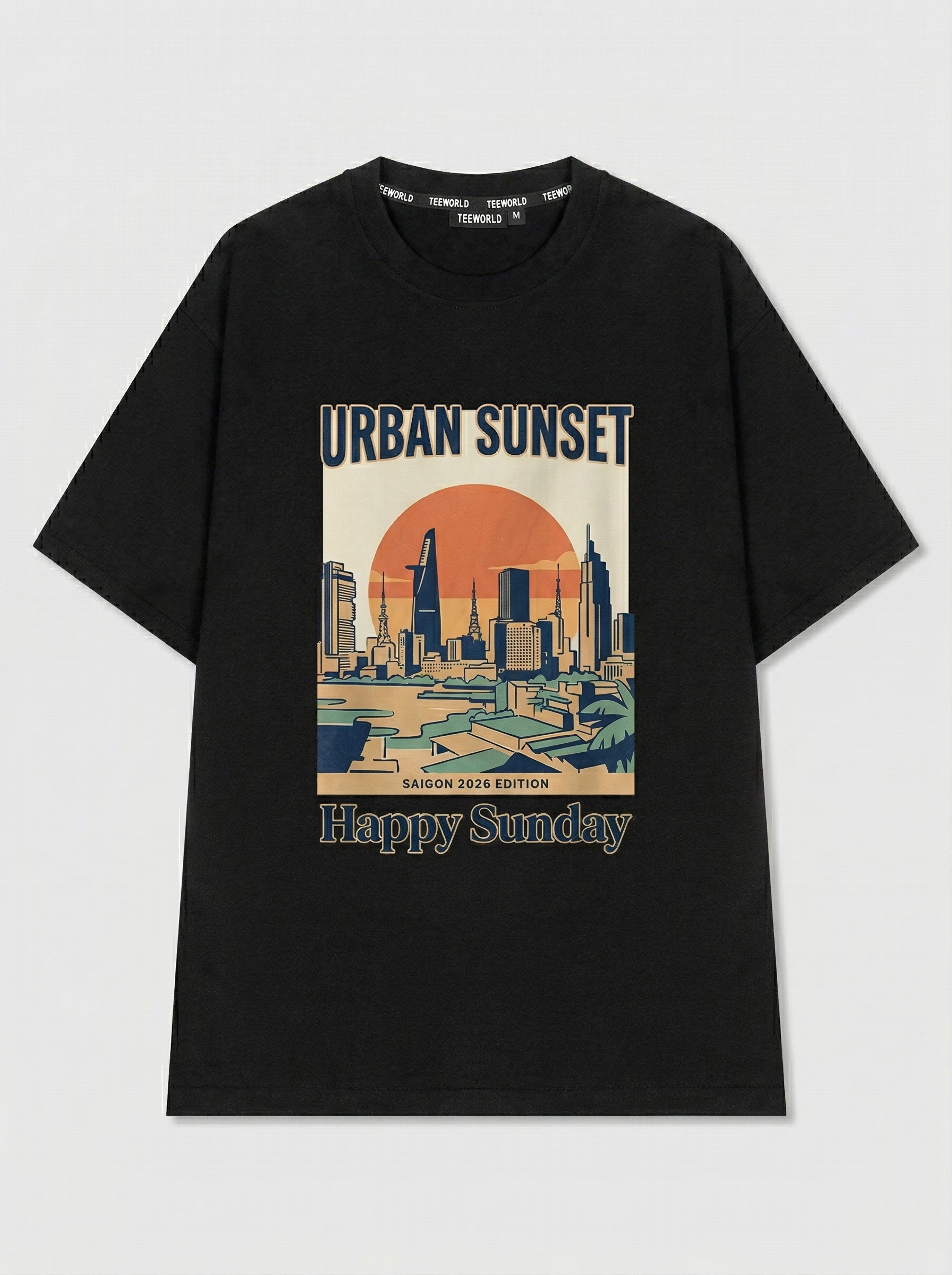 Skyline Glow - Thiết kế độc quyền từ Happy Sunday. Chất liệu: Cotton Premium 250gsm, form oversize thoải mái. In ấn: Công nghệ in sắc nét, bền màu sau nhiều lần giặt. Phong cách: Đồ họa nghệ thuật, nổi bật.