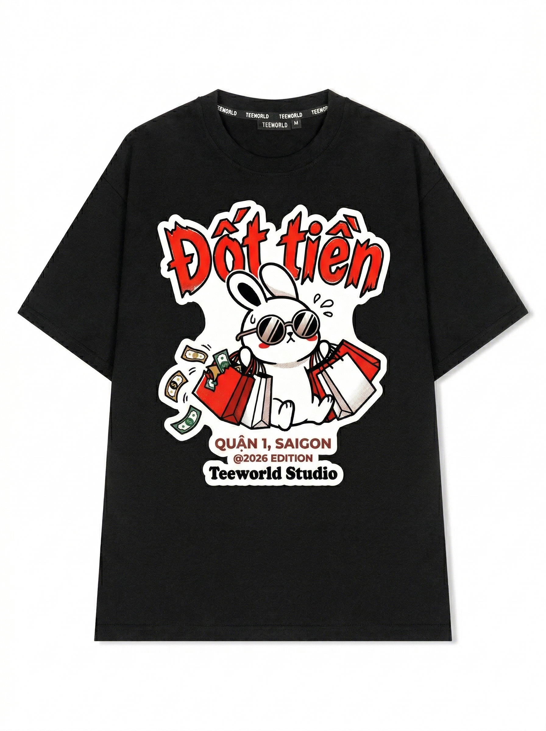 Thỏ Đốt Tiền - Thiết kế độc quyền từ Teeworld. Chất liệu: Cotton Premium 250gsm, form oversize thoải mái. In ấn: Công nghệ in sắc nét, bền màu sau nhiều lần giặt. Phong cách: Streetwear hiện đại, dễ phối đồ.