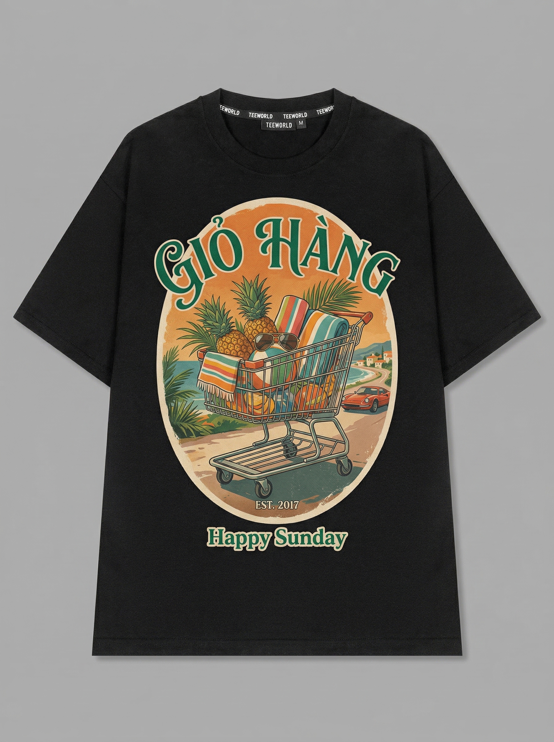Tropical Cart - Thiết kế độc quyền từ Happy Sunday. Chất liệu: Cotton Premium 250gsm, form oversize thoải mái. In ấn: Công nghệ in sắc nét, bền màu sau nhiều lần giặt. Phong cách: Streetwear hiện đại, dễ phối đồ.