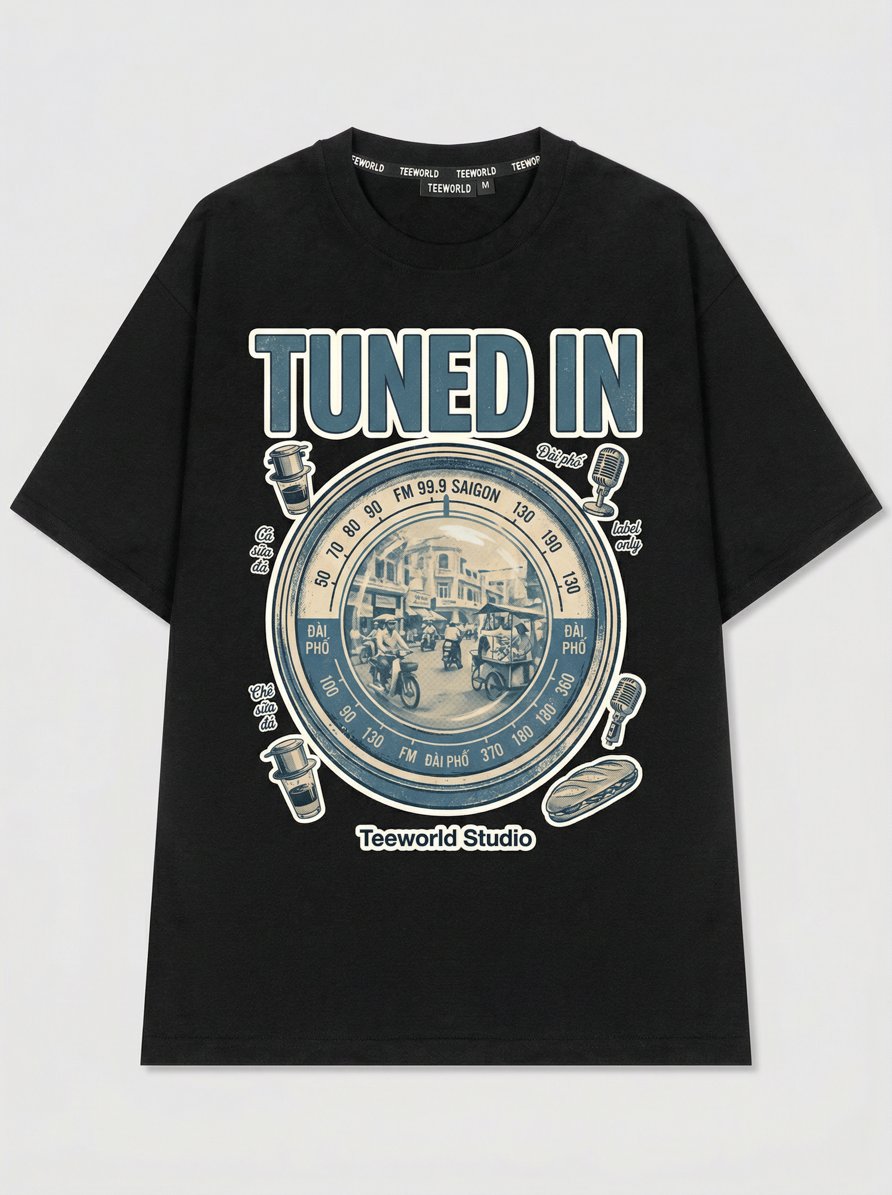 Tuned In - Thiết kế độc quyền từ Teeworld. Chất liệu: Cotton Premium 250gsm, form oversize thoải mái. In ấn: Công nghệ in sắc nét, bền màu sau nhiều lần giặt. Phong cách: Streetwear hiện đại, dễ phối đồ.