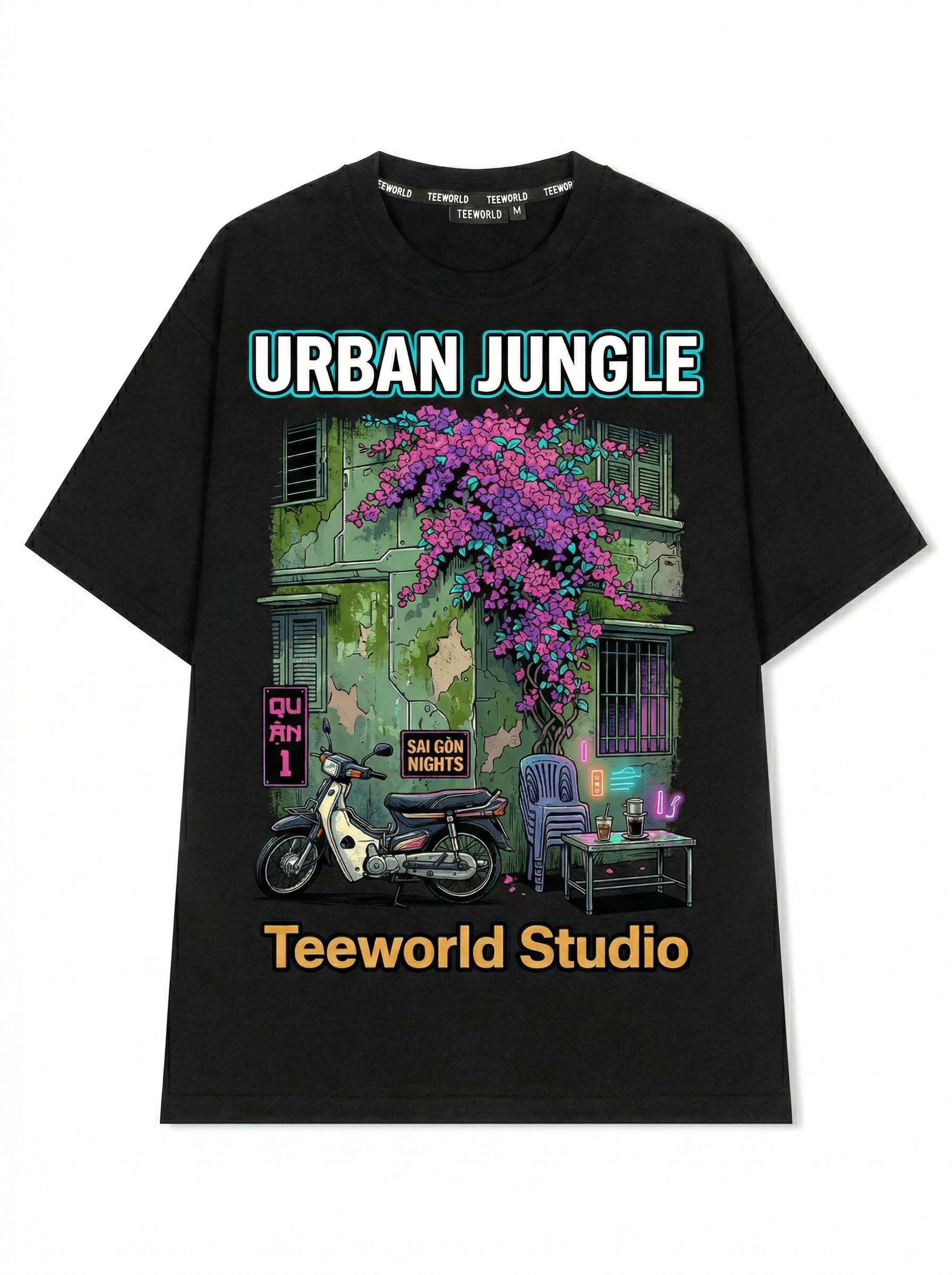 Urban Jungle - Thiết kế độc quyền từ Teeworld. Chất liệu: Cotton Premium 250gsm, form oversize thoải mái. In ấn: Công nghệ in sắc nét, bền màu sau nhiều lần giặt. Phong cách: Streetwear hiện đại, dễ phối đồ.