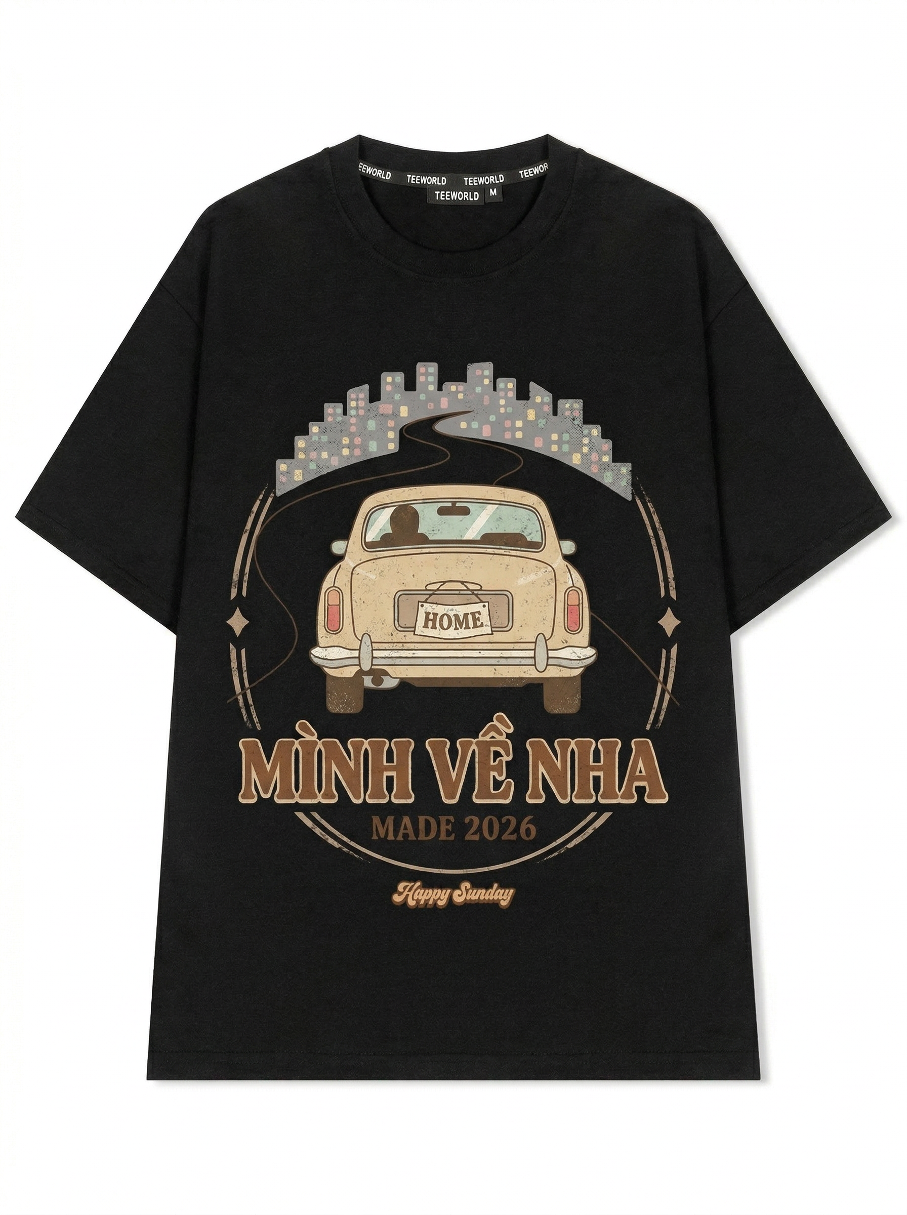 Xe Về Nhà - Thiết kế độc quyền từ Happy Sunday. Chất liệu: Cotton Premium 250gsm, form oversize thoải mái. In ấn: Công nghệ in sắc nét, bền màu sau nhiều lần giặt. Phong cách: Streetwear hiện đại, dễ phối đồ.